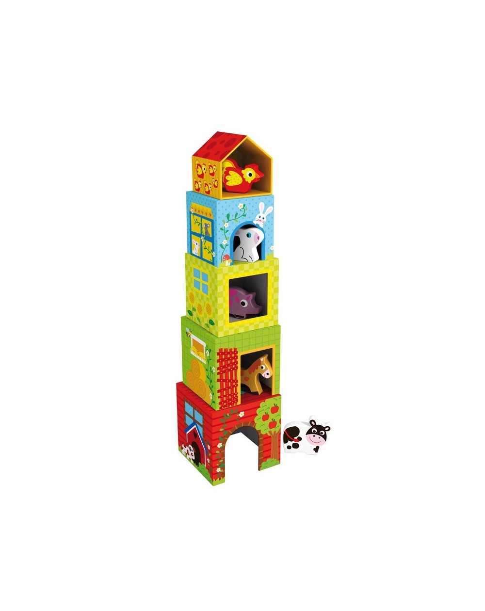 5 Cubos apilables de cartón con 5 animalitos de granja de madera.